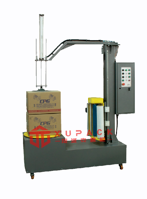 主要针对较小物件的包装,可四面包装,也可六面包装膜架预拉伸膜架,可提升拉升率;转盘转动设定时间后自动停止;配有压顶装置,防止包装过程中货物散包;按钮式操作面板,简单明了,也可根据客户要求制作触屏面板。